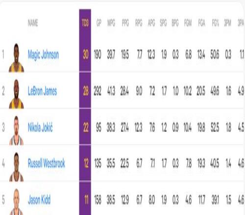 3.約基奇生涯22次三雙排聯(lián)盟第三,距離第二的詹姆斯只差6次,距離第一的魔術(shù)師只差8次;