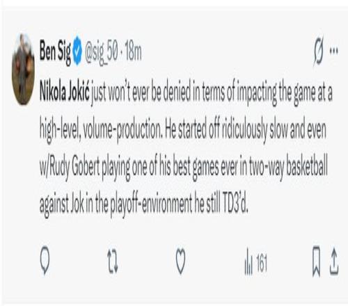 掘金記者Ben Sig寫道:約基奇在高水平的季后賽中影響比賽方面依舊無人能擋,他在開局非常慢熱的情況下也碾碎的了戈貝爾,說實(shí)話戈貝爾已經(jīng)打出他生涯最好的攻防表現(xiàn),可約基奇還是拿到了三雙。