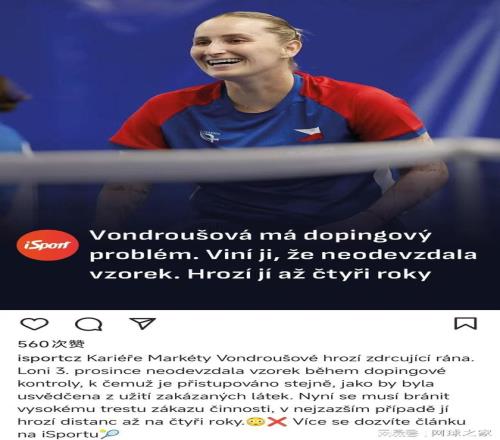 當(dāng)?shù)貢r(shí)間4月17日,2023年溫網(wǎng)女單冠軍、捷克名將萬卓索娃被國際網(wǎng)球誠信機(jī)構(gòu)(ITIA)正式指控?zé)o正當(dāng)理由拒絕接受樣本采集,可能面臨最高4年禁賽的重罰。