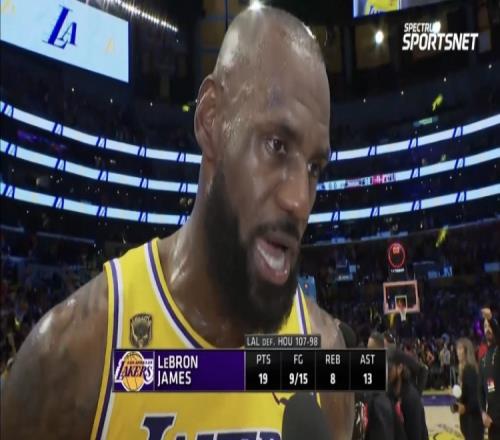 體育播報(bào)4月19日宣 今日,湖人在季后賽首輪G1中107-98主場擊敗火箭,系列賽1-0領(lǐng)先。賽后,湖人球星詹姆斯接受了采訪。