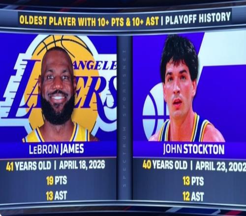 據(jù)統(tǒng)計,詹姆斯(41歲109天)得到得分助攻的兩雙,歷史最老(此前紀錄由斯托克頓保持)。