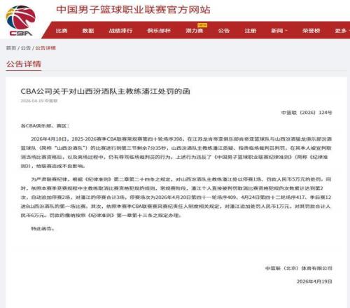 北京時間4月19日消息,CBA常規(guī)賽收官階段,山西汾酒隊卻接連遭遇打擊。4月19日,CBA公司公布處罰決定,球隊主教練潘江因在與江蘇肯帝亞隊比賽中指責、辱罵裁判員,被處以停賽3場、罰款6萬元的處罰。這意味著他將缺席常規(guī)賽最后兩場對陣廣東宏遠和南京同曦的比賽,以及季后賽12進8的首場對決。雪上加霜的是,這已經(jīng)是山西隊本賽季收到的第四張罰單,罰單數(shù)量領跑全聯(lián)盟,賽場紀律問題儼然成為球隊前進路上的絆腳石。