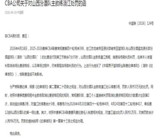 2026年4月18日,2025-2026賽季CBA常規(guī)賽第四十輪,在江蘇87-86爆冷險(xiǎn)勝山西的比賽,第三節(jié)還剩7分35秒時(shí),山西主教練潘江質(zhì)疑、指責(zé)臨場(chǎng)裁判員判罰,在其本人被宣判取消當(dāng)場(chǎng)比賽資格后,以及離場(chǎng)過(guò)程中,潘江仍有辱罵臨場(chǎng)裁判員的行為。上述行為違反《中國(guó)男子籃球職業(yè)聯(lián)賽紀(jì)律準(zhǔn)則》,給聯(lián)賽造成不良影響。