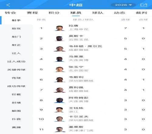 中超射手榜:拉唐7球居首,奧斯卡、韋林頓席爾瓦5球隨后