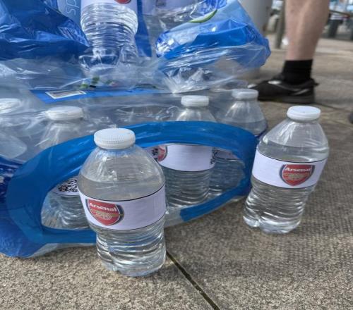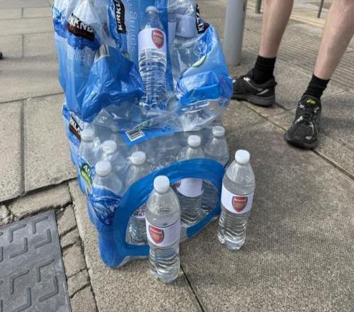記者Alex Howell發(fā)布照片稱,在曼城主場對陣阿森納賽前,有曼城球迷在阿提哈德球場外出售貼有阿森納隊(duì)徽的瓶裝水。
