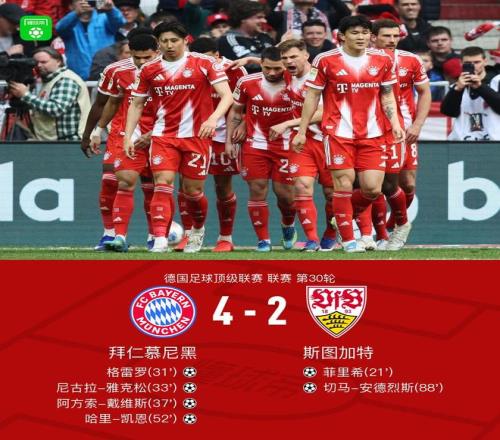 北京時(shí)間4月19日德國(guó)足球頂級(jí)聯(lián)賽 聯(lián)賽 第30輪,拜仁慕尼黑主場(chǎng)對(duì)陣斯圖加特。拜仁慕尼黑格雷羅破門,尼古拉-雅克松破門,阿方索-戴維斯破門,哈里-凱恩破門。斯圖加特菲里希破門,切馬-安德烈斯破門。最終比分拜仁 4-2 斯圖加特。