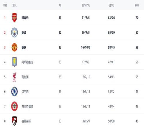 在積分榜上,阿森納雖然輸球,依然占據(jù)榜首位置,總積分是70分。曼城越追越近,總積分達(dá)到67分,只比阿森納少3分。而且,曼城還少賽一場(chǎng)。沒(méi)想到爭(zhēng)冠格局會(huì)變得如此激烈。阿森納此前積累的優(yōu)勢(shì)被不斷消耗。曼聯(lián)以58分排名第3。阿斯頓維拉贏球之后,也是58分,排名第4。利物浦以55分排名第5。切爾西48分排名第6。至于熱刺,只拿到31分,排名倒數(shù)第3,深陷降級(jí)區(qū)。