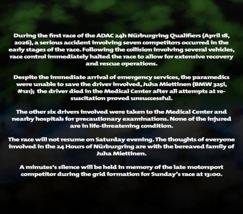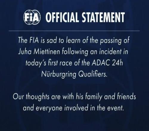 從2018年開始,Juha Miettinen在紐博格林賽事中登上了25次領(lǐng)獎(jiǎng)臺(tái),并斬獲5次冠軍。國際汽聯(lián)通過官方社交媒體,向這位優(yōu)秀車手的離世表示哀悼:“FIA剛剛得知Juha Miettinen在今天紐博格林24小時(shí)耐力賽首場(chǎng)比賽中因事故不幸去世的消息,感到非常難過。我們和他的家人、朋友,以及所有參與這次比賽的人一起,深感悲痛?!?/p>