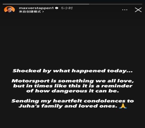 四屆F1世界冠軍維斯塔潘也參與了本站賽事,萬幸的是事故發(fā)生時(shí),他還沒有登場(chǎng)。此后,維斯塔潘也通過社媒向Juha Miettinen的家人和朋友表達(dá)了深切的慰問。