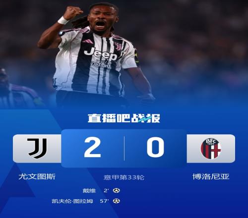 下半場(chǎng)補(bǔ)時(shí)3分鐘。最終全場(chǎng)比賽結(jié)束,尤文2-0博洛尼亞。