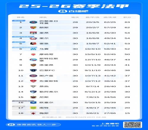 法甲積分榜:巴黎主場翻車不敵里昂,少賽1輪暫時只領(lǐng)先朗斯1分 直播吧 2026-04-20 07:12:10 體育播報04月20日宣 法甲第30輪,巴黎1-2里昂,本輪比賽已經(jīng)全部結(jié)束。最新的積分榜方面,巴黎比朗斯少賽1輪,暫時只領(lǐng)先爭冠對手1分。 足球里昂巴黎圣日耳曼朗斯法甲 上一篇: 6連勝遭終結(jié)!巴黎12里昂暫1分領(lǐng)跑恩德里克傳射G拉莫斯失點下一篇: 愿無大礙!巴黎中場維蒂尼亞第39分鐘傷退被換下,疑似右腳踝扭傷
