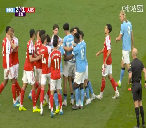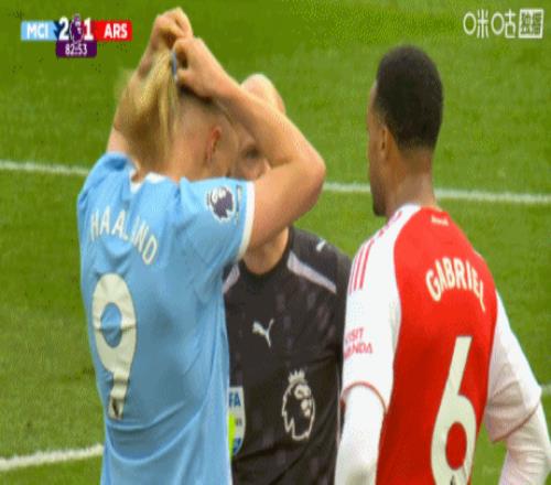 體育播報(bào)04月20日宣 曼城vs阿森納第83分鐘,哈蘭德、加布里埃爾頂牛兩隊(duì)爆發(fā)沖突,兩人各吃一黃!