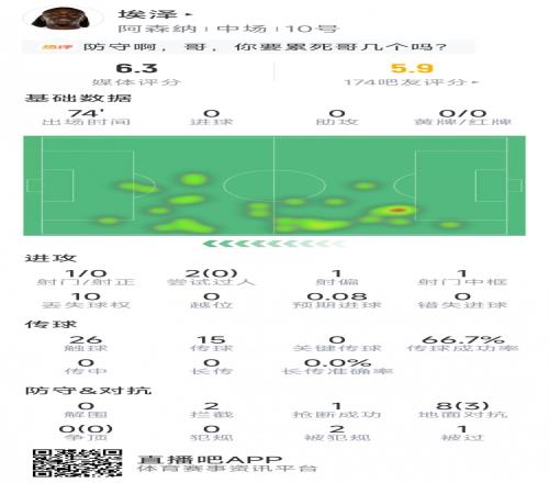 體育播報4月20日宣 在本輪英超曼城對陣阿森納比賽中,埃澤首發(fā)出場,以下為他在本場數(shù)據(jù):