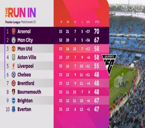最后會是攻擊力之爭嗎槍手凈勝球37曼城36,曼城少賽1場落后3分
