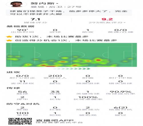 努內斯本場數據:1次助攻,2解圍,2搶斷,1關鍵傳球,評分7.1分