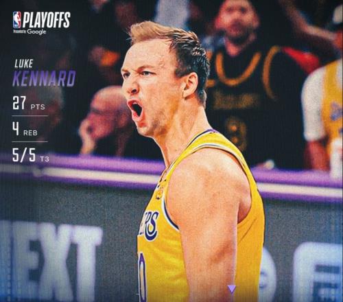 湖人的首輪G1盧克-肯納德發(fā)揮亮眼,他賽后被譽(yù)為‘盧克魔法’。相信大家都知道東契奇有個綽號是‘盧卡魔法’,如今東契奇在場下?lián)]毛巾看著另一個魔法師發(fā)揮??霞{德此役38分鐘,13中9,三分5中5,罰球6中4,拿到27分4籃板3助攻,命中率69.2%,三分命中率100%,真實(shí)命中率86.3%。