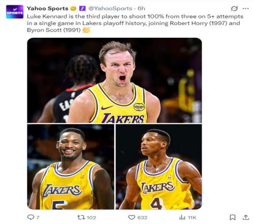 九、肯納德是湖人隊(duì)史季后賽第三場出手5次且全部命中的球員,比肩97霍里與91年斯科特;