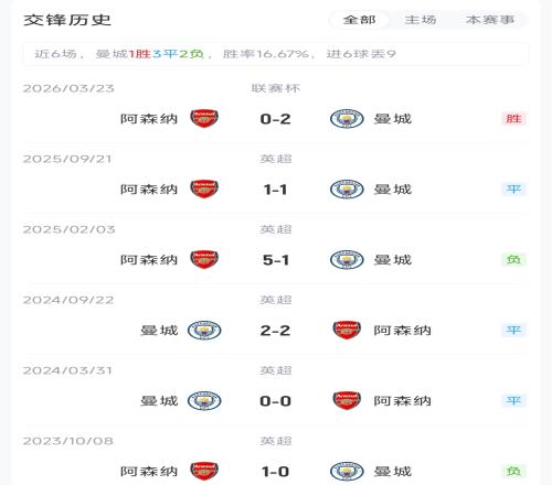 兩隊(duì)本賽季前兩次交手,英超第5輪阿森納主場1-1戰(zhàn)平曼城,聯(lián)賽杯決賽曼城2-0戰(zhàn)勝阿森納奪冠。