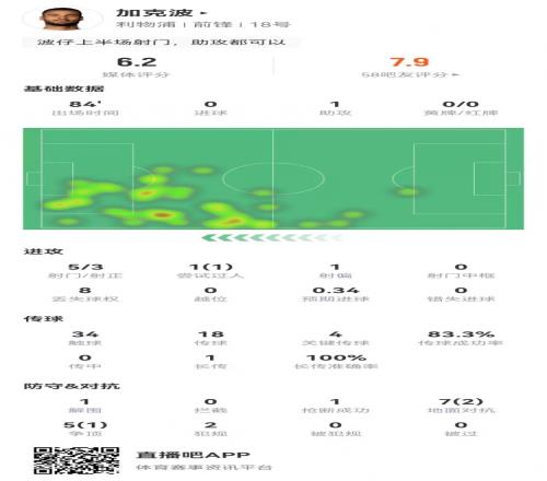 體育播報4月19日宣 利物浦在本輪英超對陣埃弗頓,加克波本場數據如下: