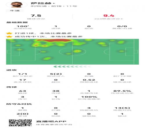 薩拉赫本場1射進(jìn)1球1關(guān)鍵傳球+17丟失球權(quán)3搶斷+15對抗5成功