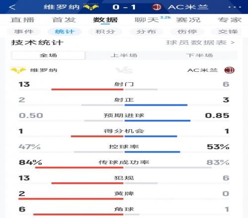 AC米蘭10維羅納全場數(shù)據(jù):射門613,射正32,得分機(jī)會(huì)11