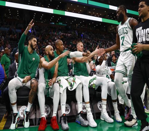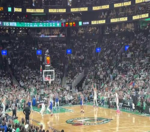 比賽最后時刻勝負(fù)已分,凱爾特人主場球迷齊聲高喊“WE WANT BOSTON”(我們要打凱爾特人)的口號嘲諷76人球迷。