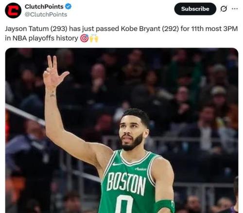 全場(chǎng)塔圖姆早早進(jìn)入狀態(tài),17中9,爆砍25分11板7助2斷全能數(shù)據(jù),正負(fù)值+20,季后賽三分總命中數(shù)來(lái)到293記,成功超越他的偶像科比,升至NBA歷史第11名。