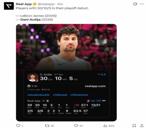 這場比賽對于阿夫迪亞來說是生涯之夜,他季后賽首秀拿到30+10+5,他比肩詹姆斯季后賽首秀,他是詹皇06年后首位季后賽首秀30+10+5的球員。