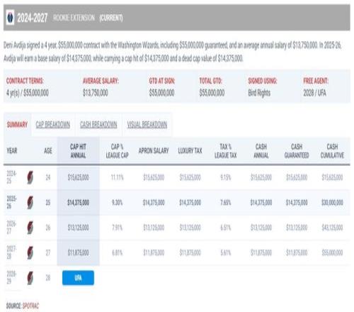 阿夫迪亞4年5500萬的合同還是遞減合同,本賽季只有1437萬,下賽季1312萬,27-28賽季1187萬。2024年6月7日開拓者用布羅格登、2024年14號簽、2029年首輪、2個次輪簽從奇才換來阿夫迪亞,不得不說這筆5換1的交易贏麻了。