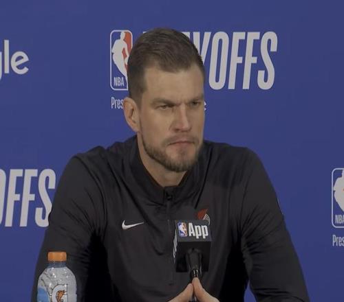 我們用不同的人去防他。一開始用卡馬拉,打小陣容時用格蘭特防了一會兒,我們的中鋒也防過。他打出了一場驚人的比賽,35分,三分6投5中,把他擋在禁區(qū)外真的很困難。