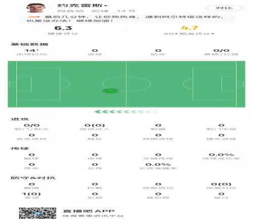尷尬!約克雷斯替補(bǔ)登場(chǎng)后0觸球,所有數(shù)據(jù)都掛零