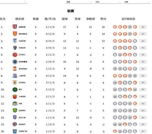 榜首方面,成都蓉城在本輪1-0戰(zhàn)勝武漢三鎮(zhèn),憑借著本場(chǎng)比賽的勝利,他們目前以5勝1平的戰(zhàn)績領(lǐng)跑。重慶銅梁龍則在本輪2-0擊敗深圳新鵬程,目前以4勝2平暫排第2。大連英博積4勝2負(fù)排在第3。
