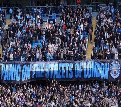 全場(chǎng)比賽結(jié)束之后,曼城球迷打出了巨大的橫幅," 倫敦街頭一片恐慌 "