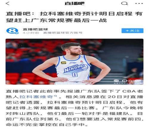 著名籃球記者趙探長(zhǎng)確認(rèn)了此事,表示“拉科確實(shí)計(jì)劃是先參加完婚禮,再來CBA”。第一時(shí)間報(bào)道拉科加盟廣東的媒體直播吧則透露,拉科塞維奇預(yù)計(jì)明日啟程,他將有望趕得上常規(guī)賽最后一場(chǎng)比賽!