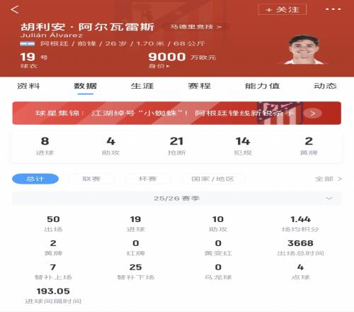 2024年夏窗,馬競花費(fèi)7500萬歐元+2000萬浮動的費(fèi)用從曼城簽下阿爾瓦雷斯,目前他共為馬競出場104次,打入48球17助攻。