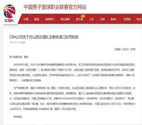 本賽季至今山西隊的戰(zhàn)績20勝20負(fù),排名常規(guī)賽第10,和上個賽季相比差距很大。近期山西隊主教練潘江因為在比賽中辱罵裁判遭籃協(xié)和CBA公司重罰,根據(jù)CBA公司官網(wǎng)的公示,潘江指導(dǎo)被禁賽3場,罰款總計6萬元,他不僅會缺席常規(guī)賽最后兩場比賽,季后賽附加賽第一場同樣無法出場指揮比賽,這次判罰還是非常嚴(yán)厲的。