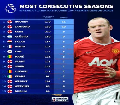 領(lǐng)跑的正是魯尼。這位英格蘭人在2004/05賽季到2014/15賽季之間,連續(xù)11個賽季英超進(jìn)球上雙,期間共打入170球。