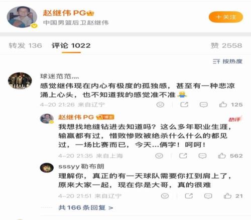 值得一提的是,遼寧男籃核心后衛(wèi)趙繼偉于賽后在個(gè)人社媒賬號(hào)發(fā)了一個(gè)“呵呵”,回復(fù)球迷時(shí)則情緒不佳,表示“我想找地縫鉆進(jìn)去”,不知道他為何如此失落。