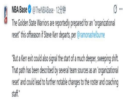 北京時(shí)間4月20日,ESPN名記Shelburne報(bào)道了勇士的未來??茽柺欠窭^續(xù)擔(dān)任主帥,很大程度上將影響這支球隊(duì)休賽期的運(yùn)作方向。