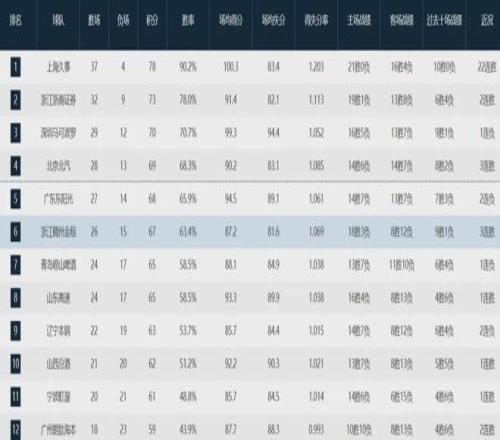 上海隊(duì)當(dāng)前戰(zhàn)績(jī)?yōu)?7勝4負(fù)高居聯(lián)盟第一,排在后面的是衛(wèi)冕冠軍廣廈隊(duì)(32-9)、深圳隊(duì)(29-12)、北京隊(duì)(28-13)、廣東隊(duì)(27-14)、浙江隊(duì)(26-15)、青島隊(duì)(24-17)、山東隊(duì)(24-17)、遼寧隊(duì)(22-19)、山西隊(duì)(21-20)、寧波隊(duì)(20-21)和廣州隊(duì)(18-23)。