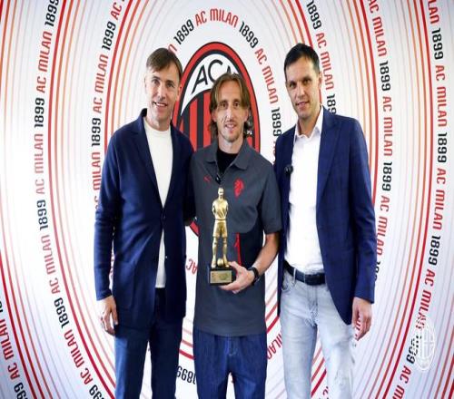 在AC米蘭俱樂部,前克羅地亞國腳、米蘭舊將達(dá)里奧-西米奇(圖中左一)向莫德里奇頒發(fā)了獎杯。