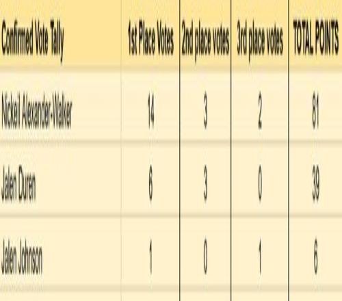進步最快球員,目前占據(jù)優(yōu)勢的是亞歷山大-沃克。已公布的21人投票中,有14人把他放在第一選票的位置上,領(lǐng)先杜倫的優(yōu)勢比較明顯。