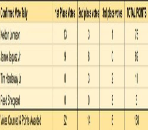 最佳第六人的競爭,預(yù)計會在凱爾登-約翰遜和小海梅-哈克斯之間進行。目前已公布的22人投票中,約翰遜拿到13張第一選票,哈克斯拿到9張第一選票,兩人的票數(shù)折算分差只有6分。