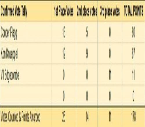 年度最佳新秀的爭奪很激烈,埃奇庫姆重在參與,主要爭奪在弗拉格和克努佩爾之間進行。已經(jīng)揭曉的25位投票者,13張第一選票屬于弗拉格,12張第一選票屬于克努佩爾,但票數(shù)轉(zhuǎn)換成積分卻是克努佩爾87-80暫時領(lǐng)先,因為他得到了更多的第二選票。