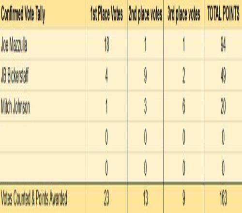至于最佳教練,馬祖拉的優(yōu)勢明顯。已經(jīng)揭曉的23位投票者,馬祖拉得到18張第一選票,比克斯塔夫得到4張,米奇-約翰遜得到1張。雖然比克斯塔夫已經(jīng)斬獲教練協(xié)會頒發(fā)的最佳教練獎,但NBA官方的最佳教練獎預(yù)計屬于馬祖拉。
