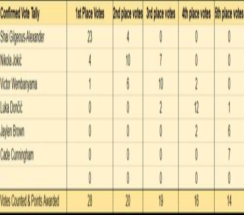 作為最重磅的獎項,常規(guī)賽MVP的歸屬懸念不大,已經(jīng)揭曉的28位投票者,亞歷山大得到23張第一選票,約基奇得到4張,文班亞馬只有1張。亞歷山大預(yù)計能蟬聯(lián)這一獎項。