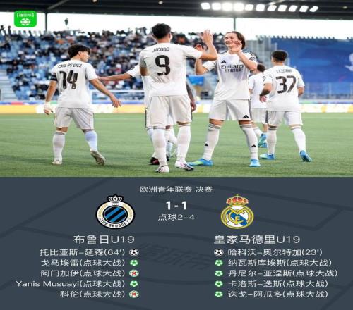 北京時(shí)間4月21日歐洲青年聯(lián)賽 決賽,布魯日U19 對(duì)陣皇家馬德里U19。布魯日U19 托比亞斯-延森破門。皇家馬德里U19哈科沃-奧爾特加破門。最終比分布魯日U19 3-5 皇家馬德里U19。