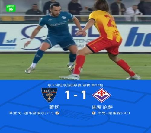 北京時(shí)間4月21日意大利足球頂級(jí)聯(lián)賽 聯(lián)賽 第33輪,萊切主場(chǎng)對(duì)陣佛羅倫薩。萊切蒂亞戈-加布里埃爾破門。佛羅倫薩杰克-哈里森破門。最終比分萊切 1-1 佛羅倫薩。