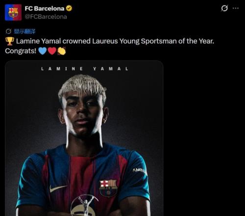 巴薩官方寫道:“拉明·亞馬爾榮膺勞倫斯年度最佳青年運(yùn)動(dòng)員獎(jiǎng)。祝賀!”