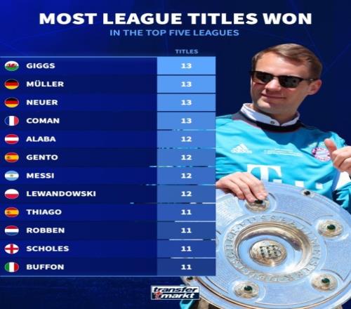 球員五大聯(lián)賽奪冠次數(shù)排行:吉格斯、諾伊爾、穆勒、科曼13次居首